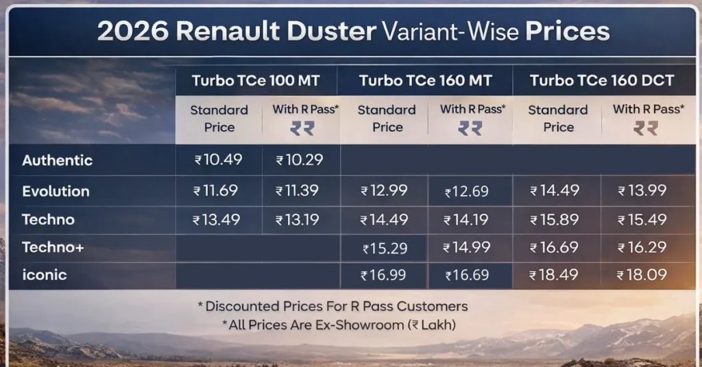 The 2026 Duster is available in five variants – Authentic, Evolution, Techno, Techno+, and Iconic, each offering a different set of features, technology, and powertrain choices.